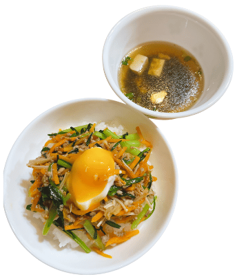 そぼろと野菜のビビンバ・小ねぎとのり、豆腐の韓国風スープ